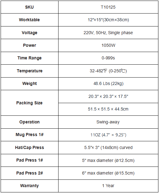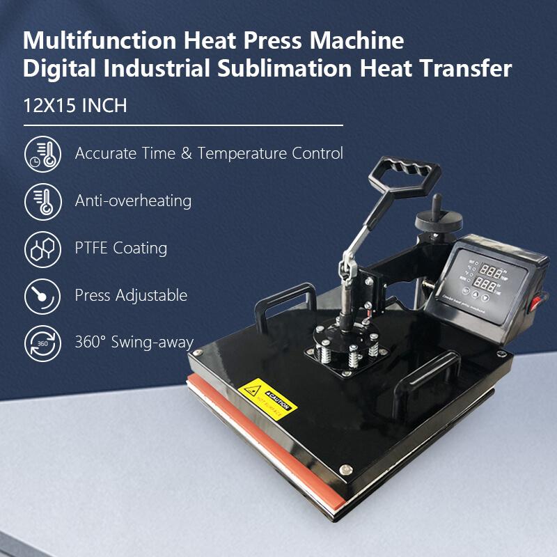 With a 12"x 15" (30 X 38 cm) large heat platen, the heat press uses Teflon-coated platen, non-stick & stable. Thickened silicone pad and sponge pad ensure flatter and even pressing because of their good elasticity. Suitable for caps, T-shirts, cups, plates, the heat press 5 in 1 saves efforts and reduces the process.
