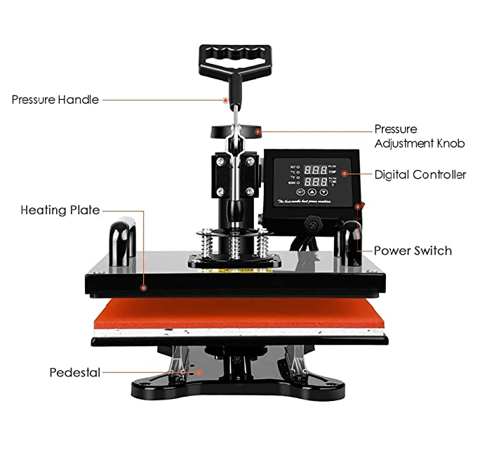 The heating plate of T-shirt press machine could greatly dissipate heat and it can automatically shut off when the temperature overheats, avoid burning, fire or other accidents. Also it is with a full-range pressure adjustment knob, so you can easily adjust the desired pressure according to the thickness of the material, better control the pressure during transfer and optimize the even transfer effect.