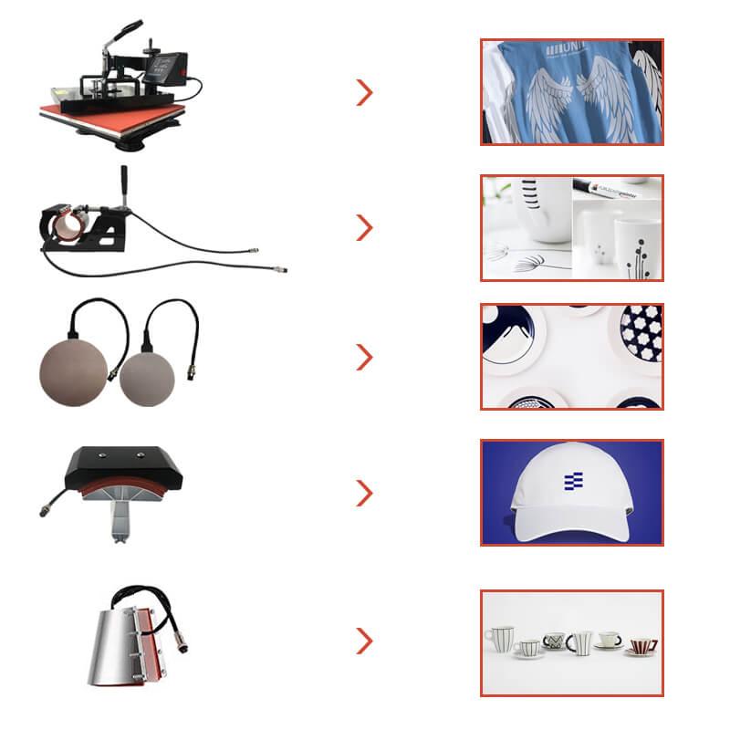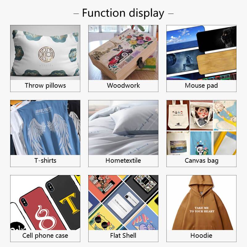 The sublimation machine can easily transfer colorful pictures and characters onto textiles, such as cotton, flax, fiber, nylon, fabric, etc. It combines with heat press transfer, mug heat press machine, cap heat press machine, pad heat press machine and t-shirt heat press machine.