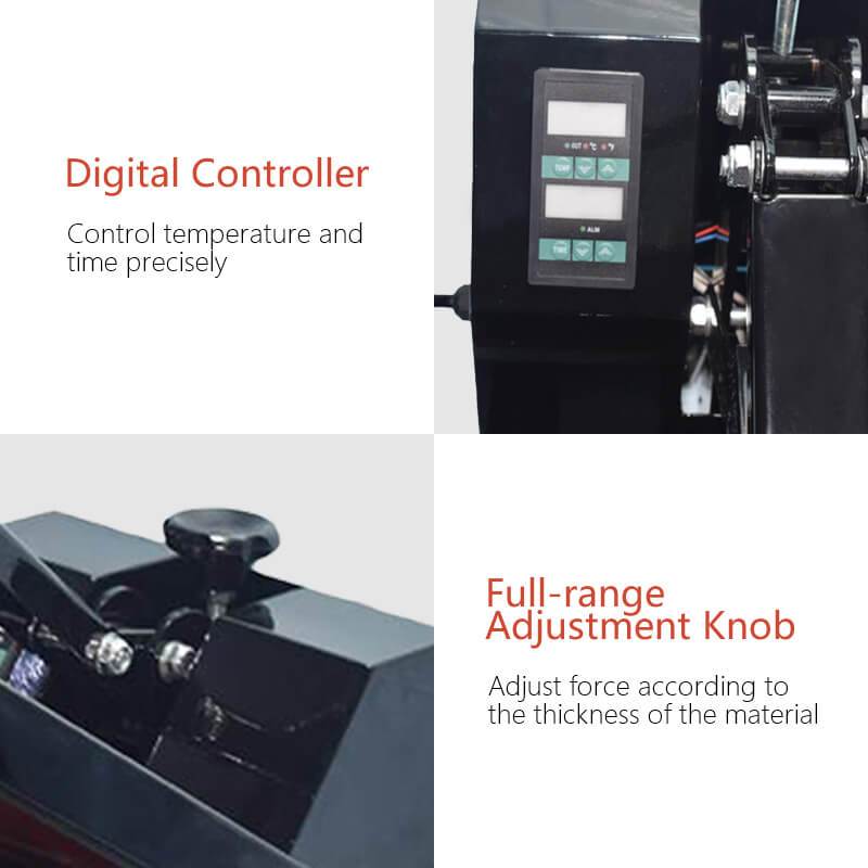 The heating plate of T-shirt press machine could greatly dissipate heat and it can automatically shut off when the temperature is overheat, avoid burning, fire or other accidents. Also it is with a full-range pressure adjustment knob, so you can easily adjust the desired pressure according to the thickness of the material, better control the pressure during transfer and optimize the even transfer effect.