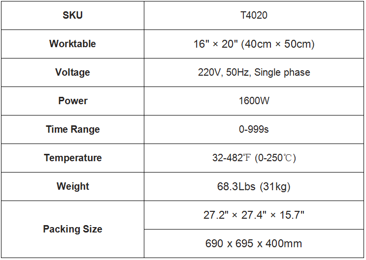 With a 16" x 20"(400 x 500mm) heat platen, the heat press uses Teflon-coated platen, non-stick & stable. Thickened silicone pad and sponge pad ensure flatter and even pressing because of their good elasticity. Suitable for mouthpad, T-shirts etc.