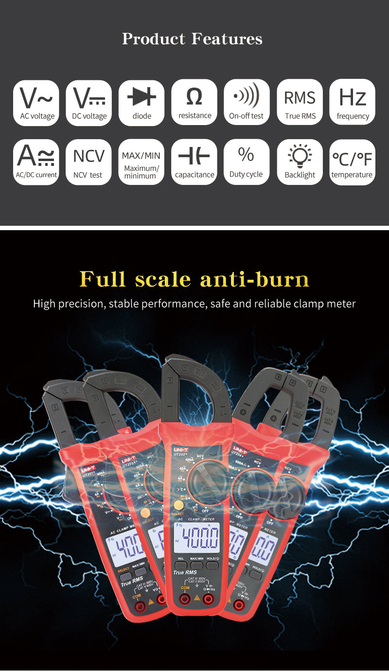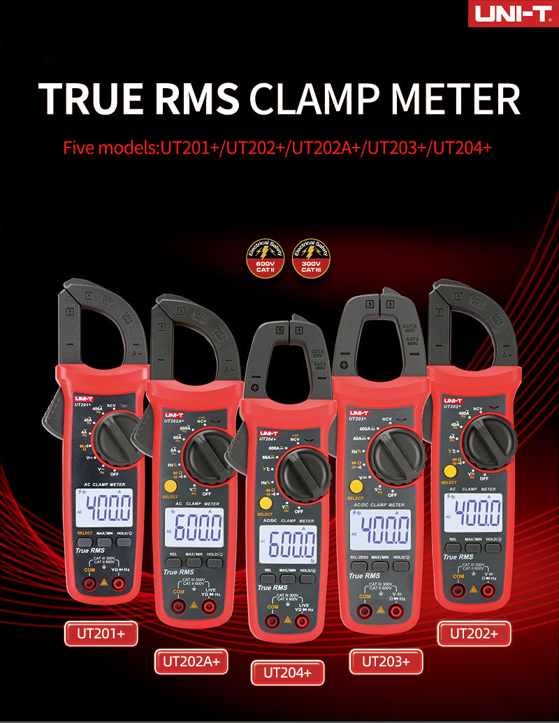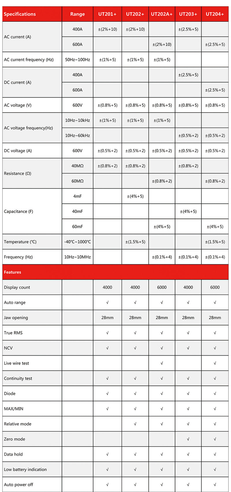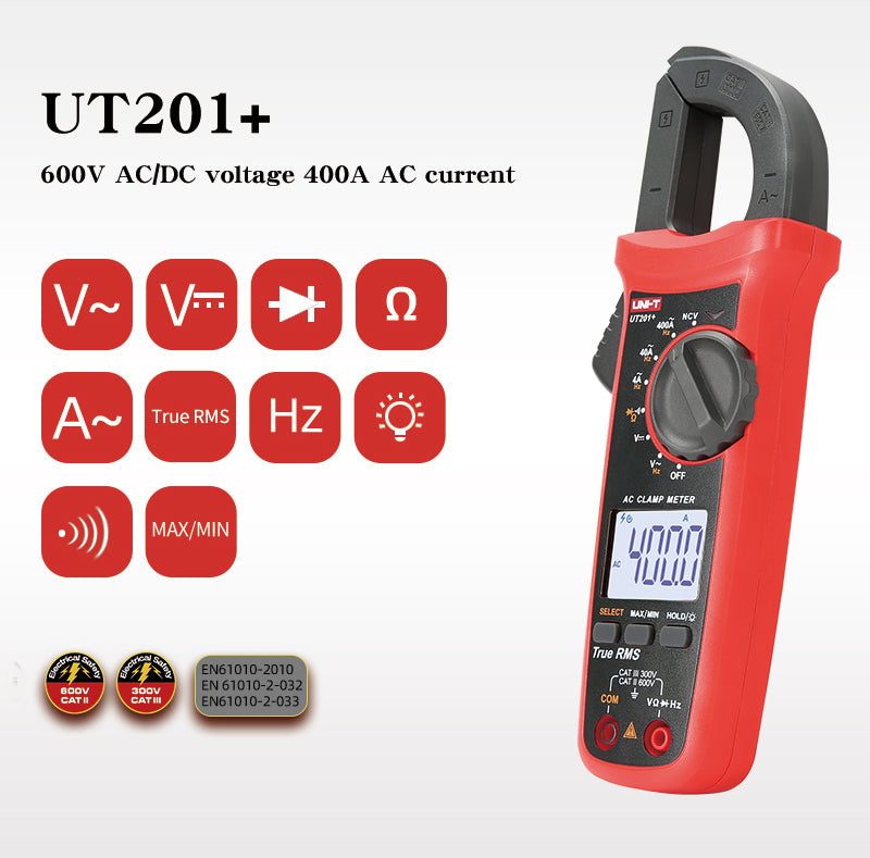 UT201+ series clamp meters have stable performance, safe and reliable characteristics. The circuit design of the whole machine is based on large-scale integrated circuit double integral A/D conversion as the core, full-range overload protection circuit, unique appearance design Make it a special electrician instrument with superior performance.